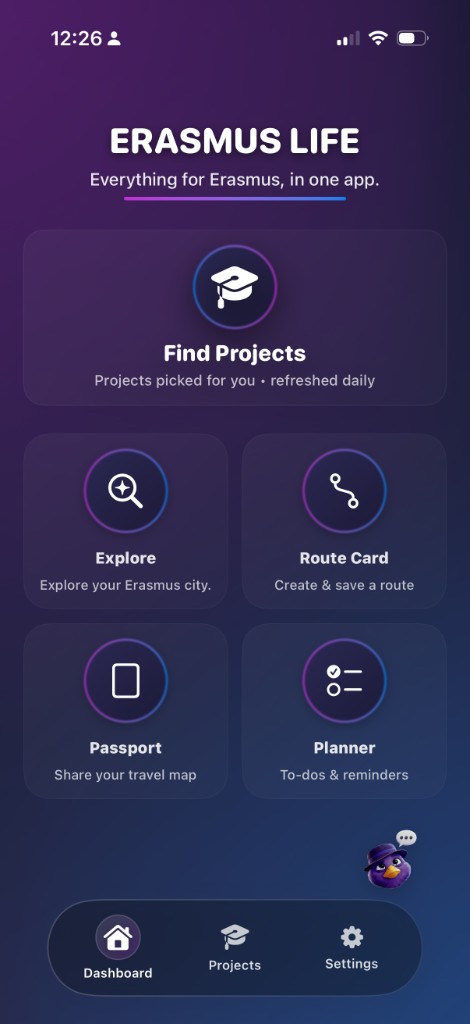 Erasmus Life brings Passport, Planner, Routes, Projects, Explore guides, and Buddy AI into one clean app.